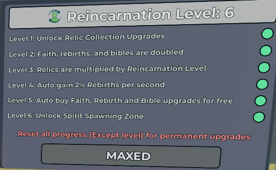 Here is a chart of the Reincarnation levels and their Faith costs!