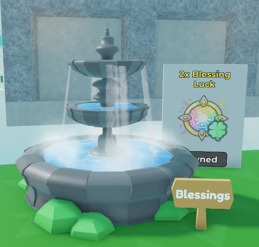 To start your journey into blessings, first go to the Blessing Fountain next to the shop and potion stand at spawn.
